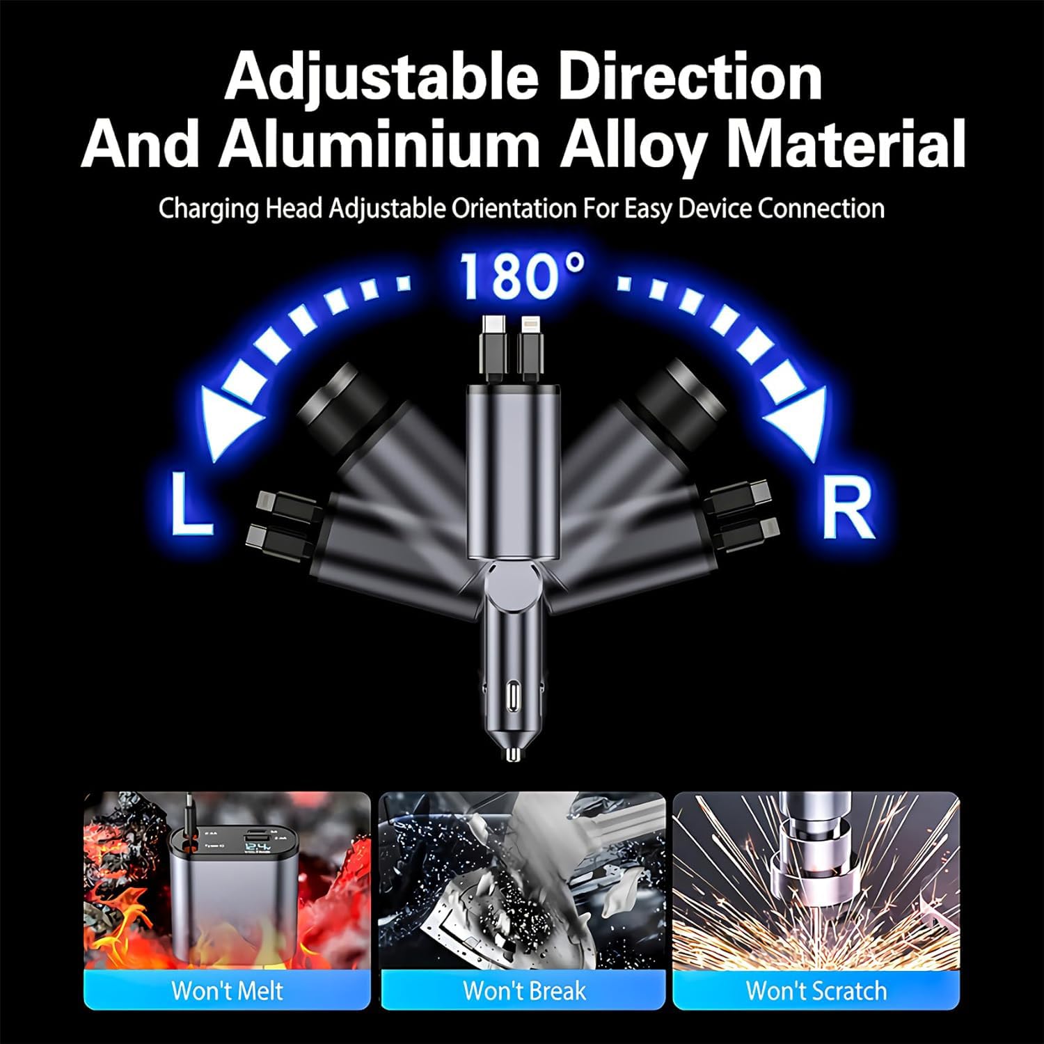 - đĄăAdjustable 180 Degree Charging Plug]ăThe charging plug can be adjusted up to 180 degrees left or right, easy to use, the plug is firm and won't pop out even when driving on bumpy roads.