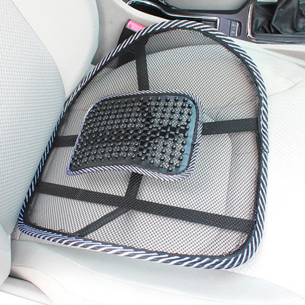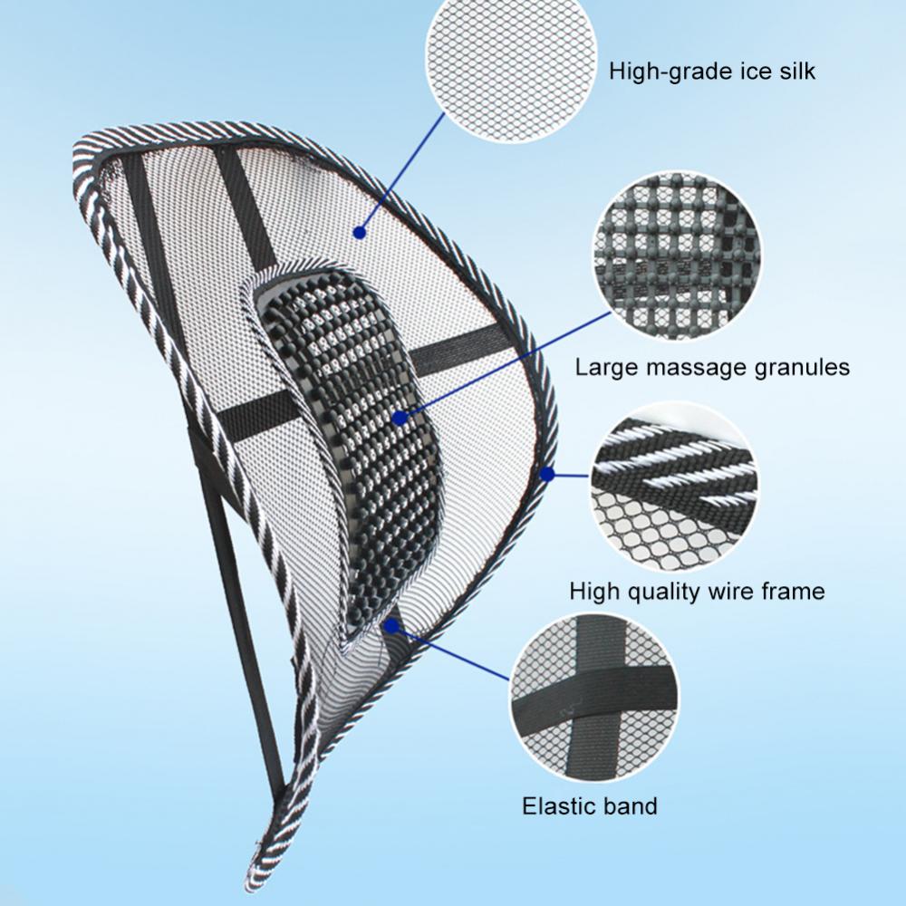 MASSAGE BEADS DESIGN - The massage beads design will keep you comfortable, provides comfort and good support to lower back. No nasty back aches, back support reduces unwanted pressure.BREATHABLE MESH DESIGN - Car lumbar support keep to your back cool with constant air flow from the ventilated net. comfort & support fot your lower back - which suffers the most during a long drive or sitting at home or at work.PRACTICAL DESIGN – Feel premium comfort at your office and kitchen chairs at home or at work. Suitable for car seat, truck seat, wheelchair, plane, couch ! It's portable and small size orthopedic mesh back support allows you to find extra bliss when you travel.PORTABLE AND EASY TO INSTALL: Take the mesh lumbar support anywhere you go and install easily within minutes to get support as a back pillow. lumbar back support cushionThe beads help massage your back, much less pressures while driving or working. Mesh material allows air circulation to keep you cool